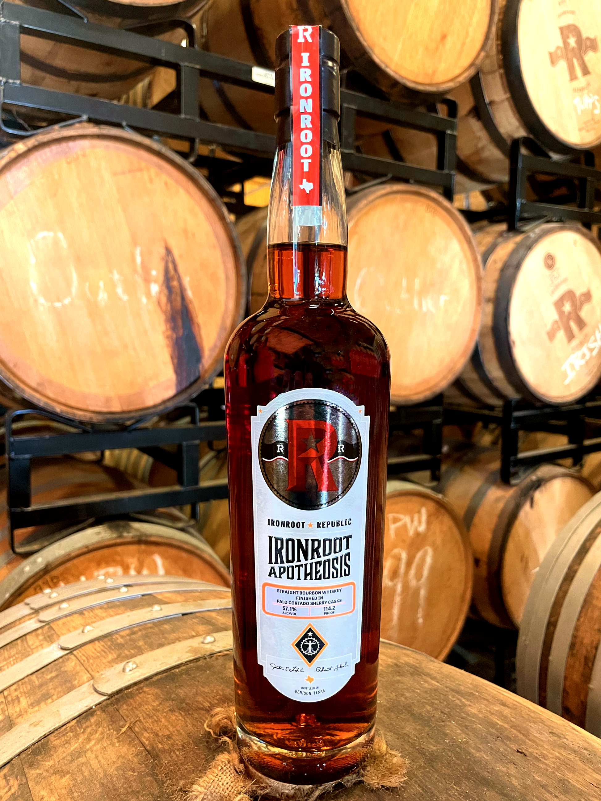 Ironroot Apotheosis is back with a bang. Apotheosis is a bold and limited-edition release that showcases the art of thoughtful aging and finishing. This expression begins with a five-year-old bourbon crafted from a distinctive blend of Ironroot's heirloom corn mash bills—Roots Purple Corn, Bloody Butcher Corn, and Floriani Flint Corn.
